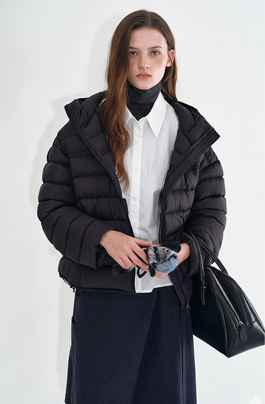 通勤党可选哑光黑立领款,短款叠穿长衬衫,搭配西装裙,专业感瞬间提升。