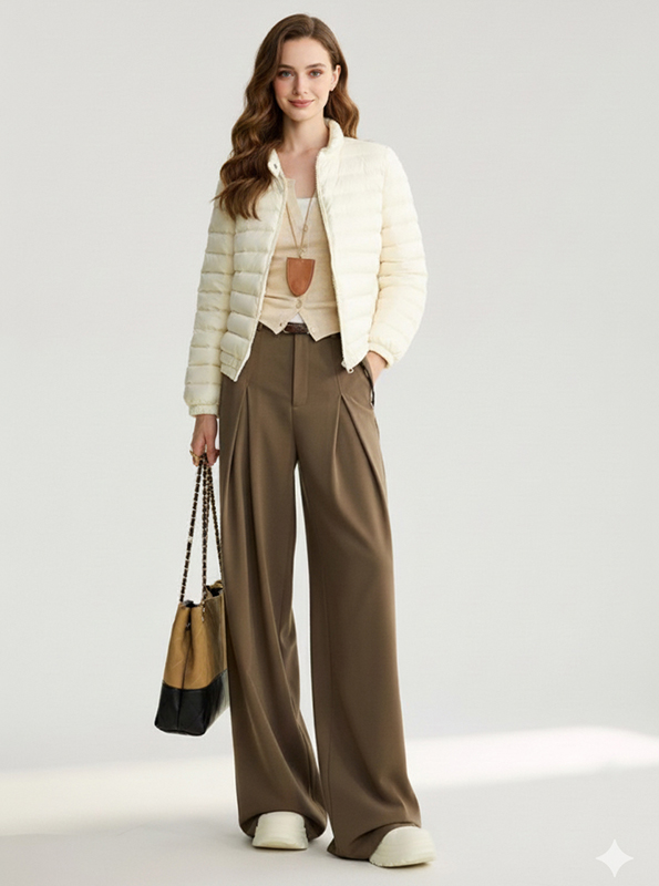 周末出街用砂岩白,搭配高腰休闲阔腿裤,视觉增高 5 厘米。