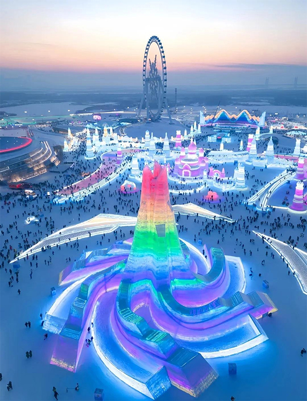 本届冰雪大世界的规模堪称历届之最,12 层楼高的主冰雕城堡在灯光下泛着梦幻蓝光,随手一拍都是壁纸级画面。